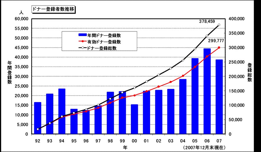 この中でドナー登録者の推移を見ますと、2006年までは年々増加してきましたが、昨年は増加率が減少となり、今後の動向が気になるところです。但し、ドナー登録総数は着実に増えていることもあり、悲観するような状況ではありませんが、より多くの方が登録することにより、待っている患者さんとの適合率が上がることを知っていただきたいと思います。