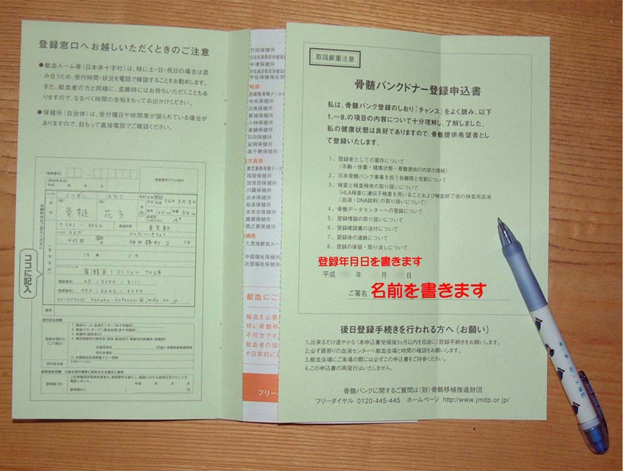 資料は「電話0120-445-445で郵送してもらう」か「ネットで申し込み、資料を郵送してもらう」方法と、ネットから直接申し込み書を印刷して申し込む方法があります。また、最寄りの献血センターや保健所に行く方法もあります。私の場合は電話で資料請求を行いました。