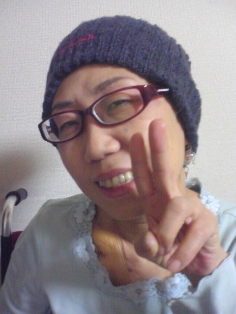 車椅子動かしながら帽子を押さえるのは