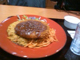 ピラフとパスタの上にハンバーグ